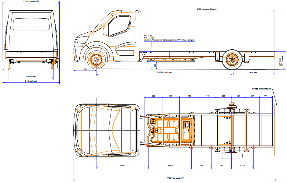 Le châssis-cabine M65-ev est disponible en empattement sur mesure de 4.5 à 6m, en hauteur H1, avec une charge utile de 650 kg sur l’essieu avant + 4 300 kg sur l’essieu arrière. Il est équipé d’une suspension arrière mécanique.